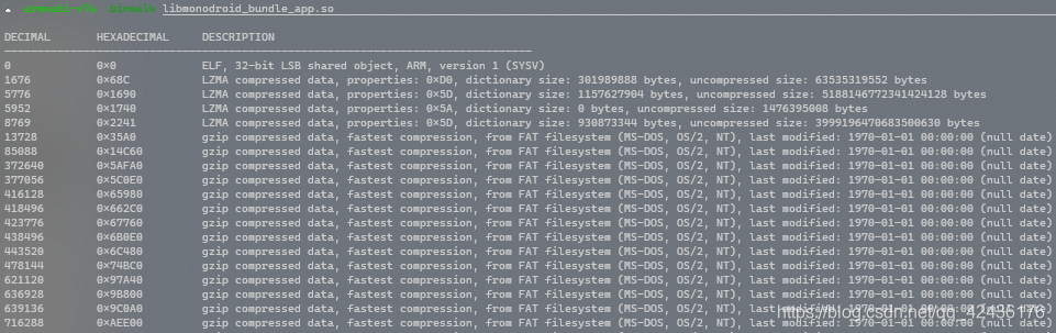 网上查询得知, 所有的C#代码都藏在 libmonodroid_bundle_app.so内, 且是个千层饼结构, 尝试使用 binwalk检查, 发现大量压缩包